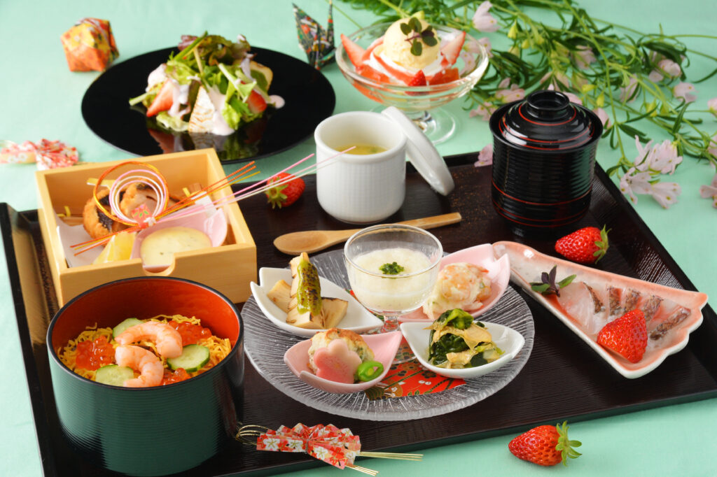 春彩の豆鉢5種をはじめ、鯛松笠造り 苺ソース、茶碗蒸し、椎茸エビ射込みフライ、苺とカマンベールチーズのヨーグルトサラダ、五目ちらし、そしていちご大福風パフェまで、春の彩りを贅沢に詰め込みました。
